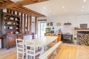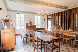Elles sont séparées par des poutres ; la cuisine/salle à manger entièrement aménagée, ornée d’une magnifique table en bois clair, et la vaste salle à manger où vous disposerez de deux grandes tables en longueur. Les espaces de notre gîte, sont ultra lumineux puisque complètement entourés de fenêtres.